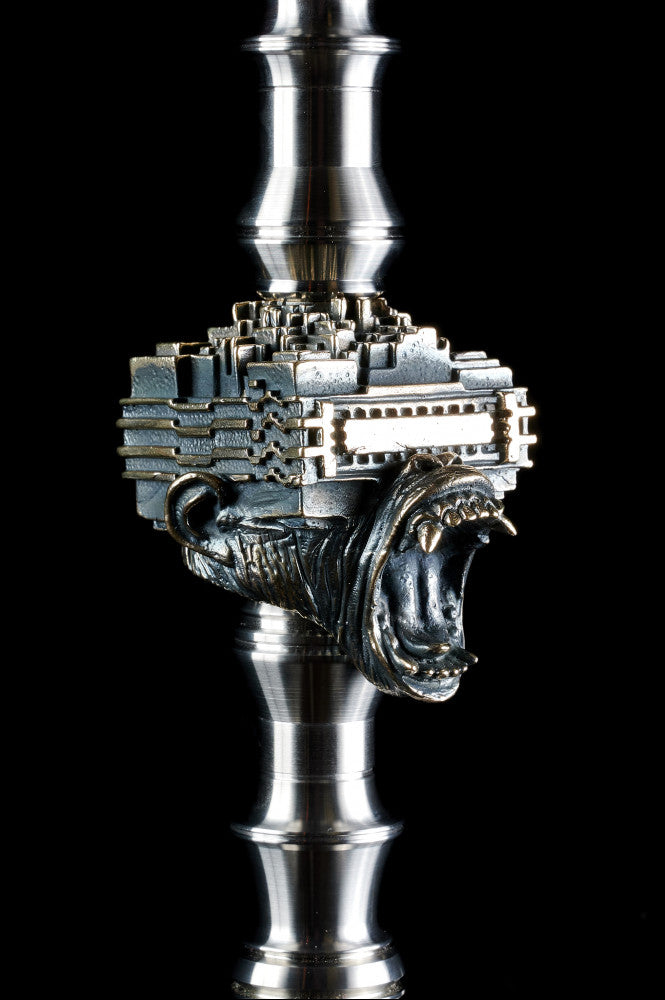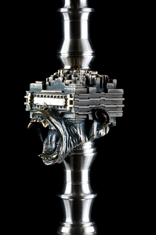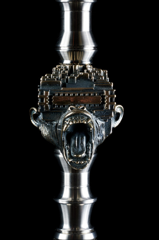 Das kunstvolle Mittelstück dieser Wasserpfeife besteht hauptsächlich aus Edelstahl AISI 304 und ist aus Bronze gefertigt und mit einer Nickelbeschichtung verziert.