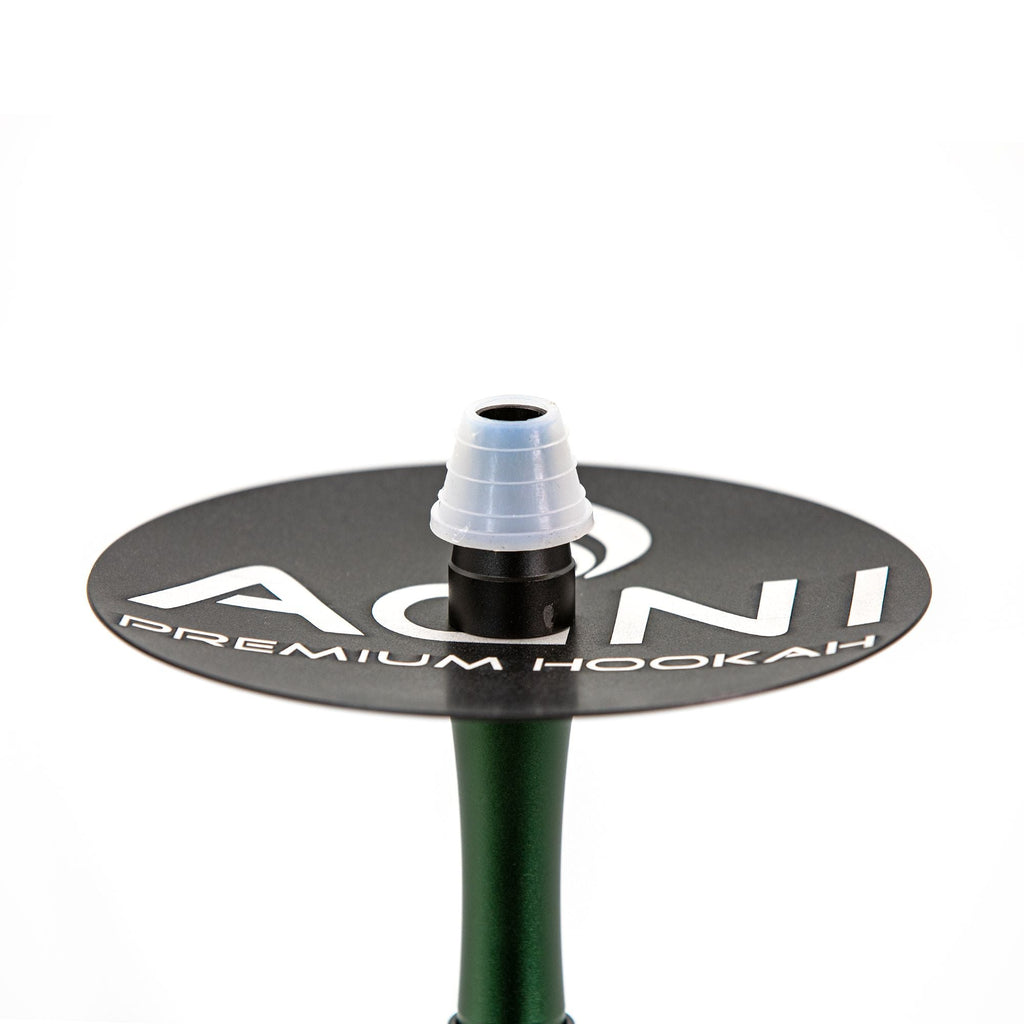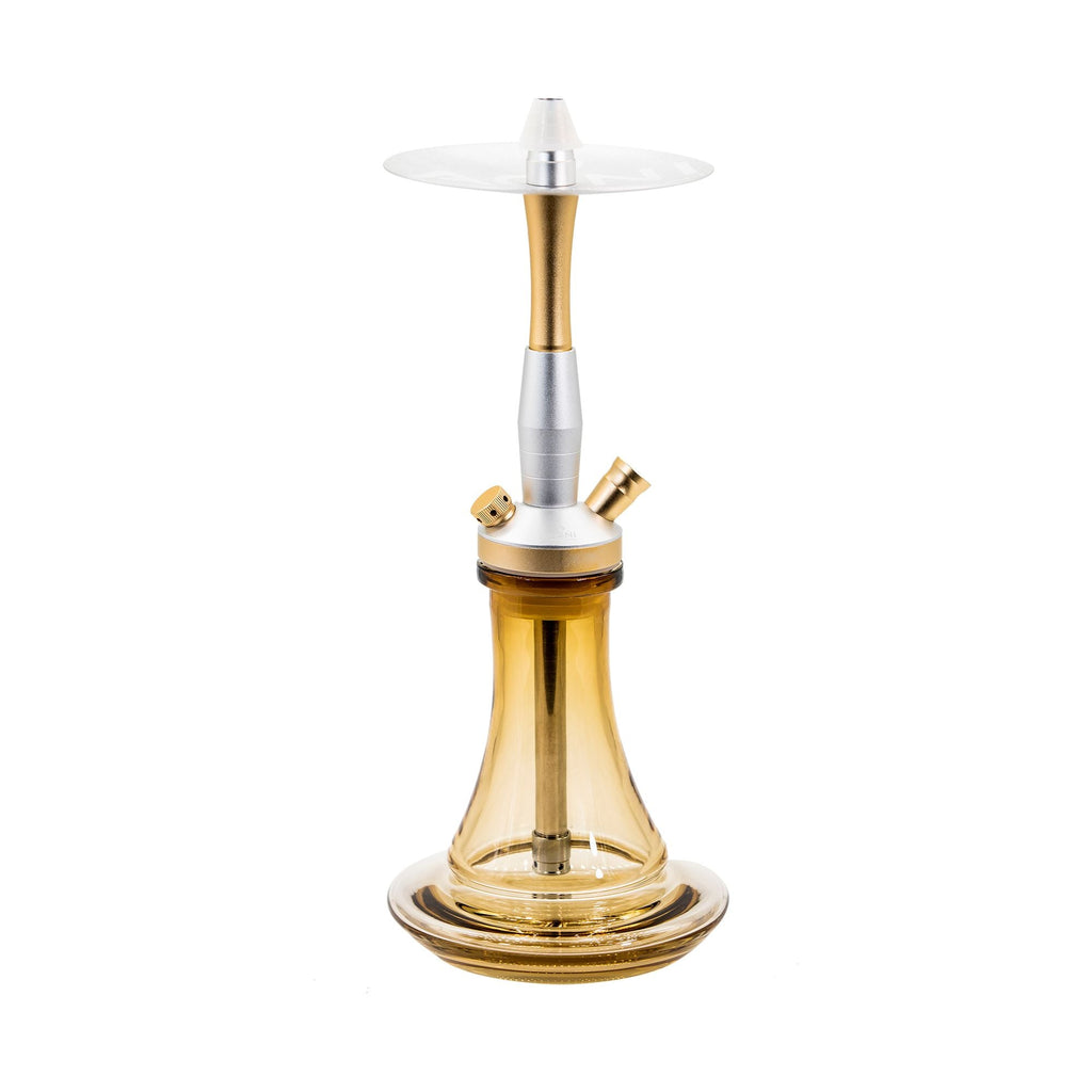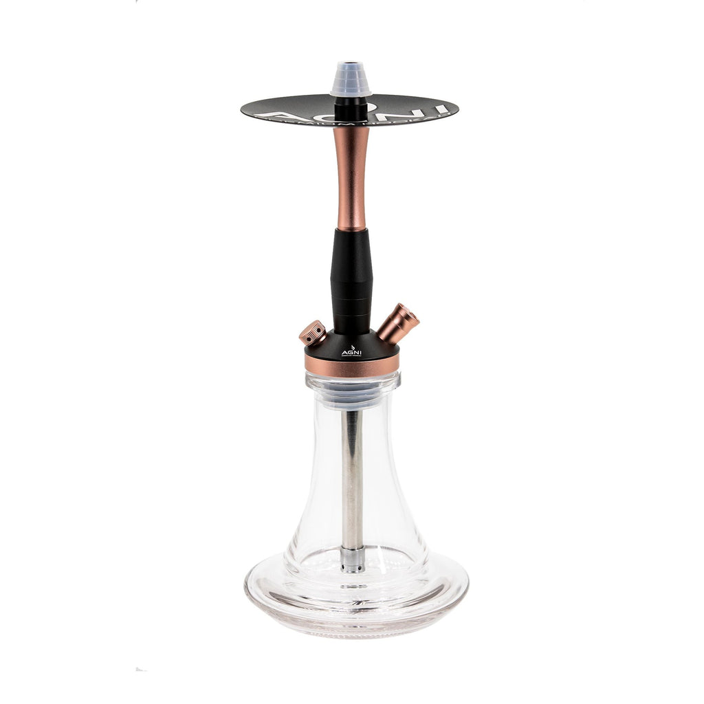 Agni Queen is a stainless steel mini hookah that comes with everything you need to get started: clay bowl, glass base, silicone hose, hose connector, hose handle, spring, tongs, and a built-in adjustable diffuser. This small hookah is 31 cm high, and the whole set, including all accessories, weighs 6.6 lb (3kg).