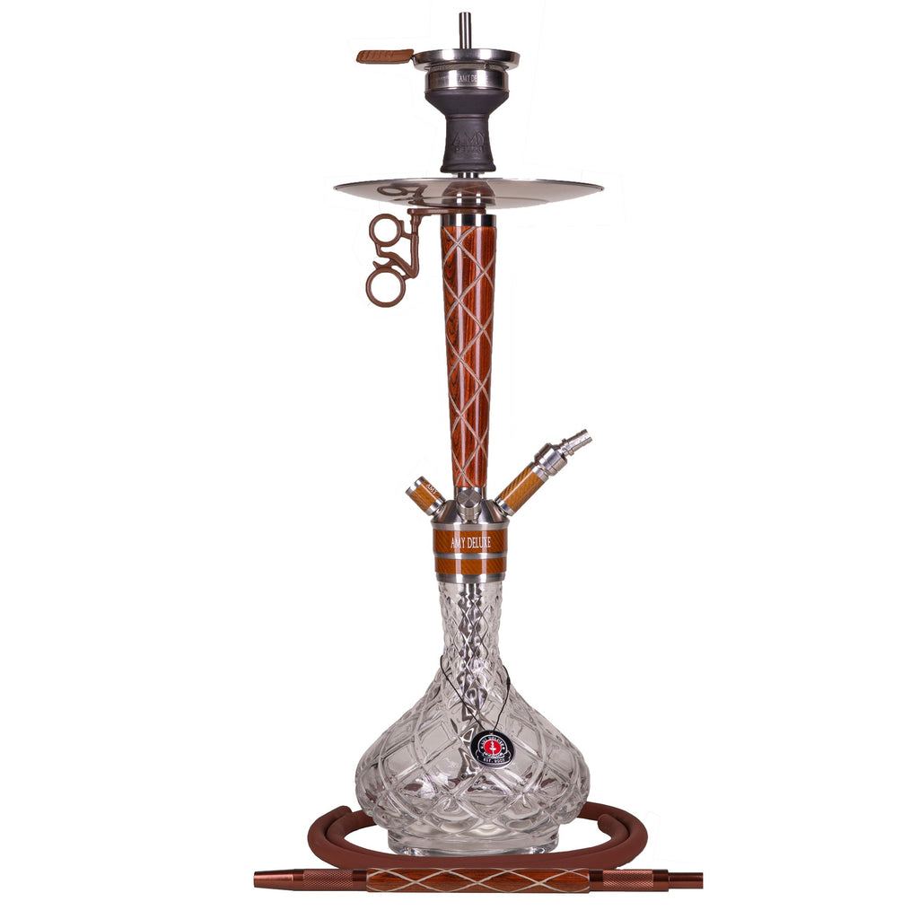 The AMY Deluxe X-Ray is particularly striking with the detailed quality bowl and the phosphorescent, artistically sculpted wooden smoke column. This shisha is an eye-catcher, whether day or night because the smoke column and the mouthpiece glow in the dark along the x-shaped indentations.