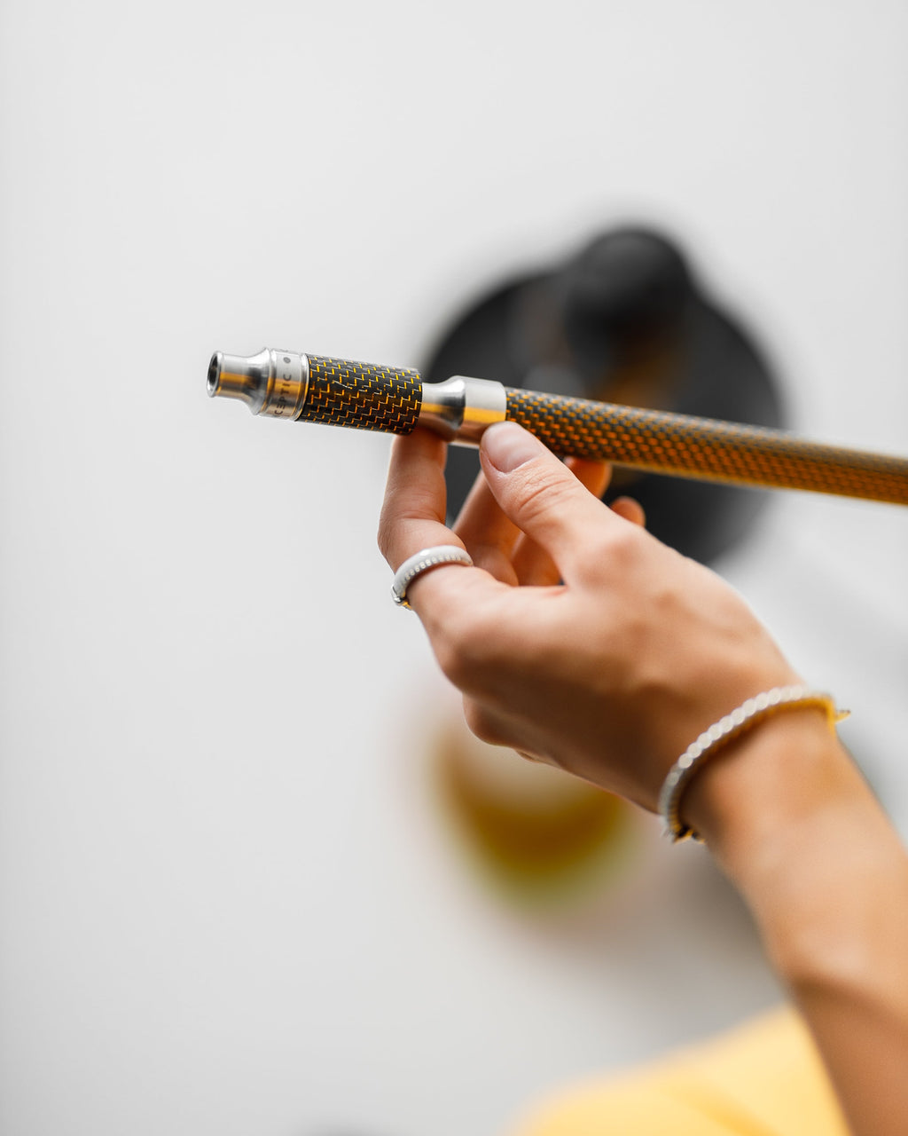 The Conceptic Capsule Personal Mouth Tip features an engraved steel tip and silicone insert inside 18mm carbon pipe. There are five carbon fiber colors to choose from: black, blue, red, green, and gold. Comes with a case for protection and hygiene.