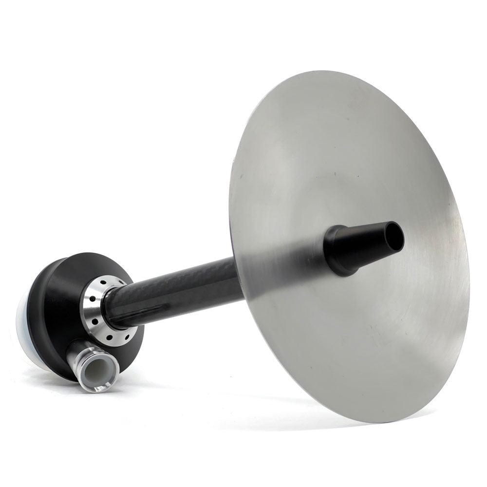 AGNI is a carbon mini hookah that comes with everything you need to get started: clay bowl, glass base, silicone hose, hose connector, hose handle, spring, tongs, and a built-in adjustable diffuser. This small hookah is 41 cm high, and the whole set, including all accessories, weighs 6.6 lb (3kg).