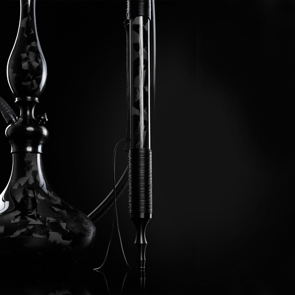 Solomon Black hookah was created in 2022. We tried to convey the aesthetics of classic oriental hookahs using modern materials. The shaft, flask, and mouthpiece are made using premium material - marble carbon. The inside of the shaft, mouthpiece, and base are made of stainless steel. The outer coating of the base, the metal tips of the mouthpiece, and the bowl connector are titanium nitride coated (black-plated). The bulb is fastened to the base of the shaft with a threaded joint. Silicone hose in Nappa leather braid. Carbon mouthpiece decorated with woven wool cord. The removable stainless steel lapped saucer is coated with embossed and titanium nitride. Mine diameter: 11 mm. Classic draught.