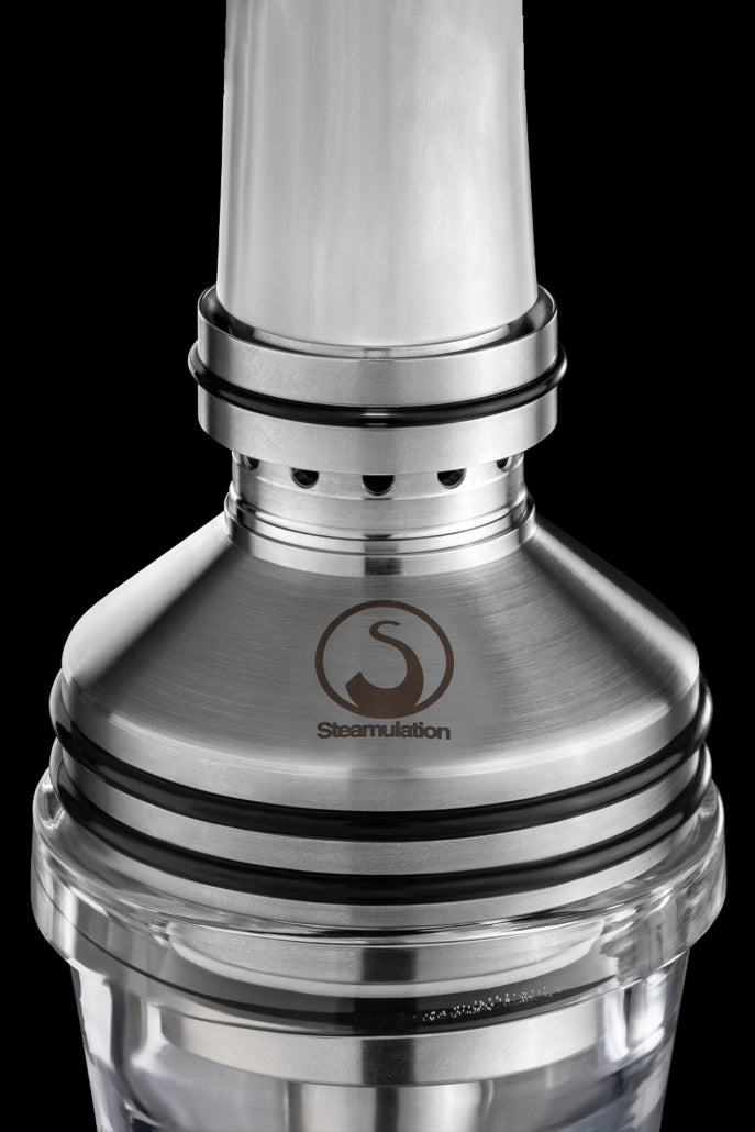 The Steamulation Xpansion Mini has a shortened version of the Dip Tube Control. With the Dip Tube Control, you can determine the length of the dip tube yourself in 6 steps. By shortening or lengthening, you can further adjust the draft and the smoking experience of your hookah. Hereby you can individualize the smoking behavior like in no other hookah. By flipping the lower dip tube element can be smoked both with and without the diffuser. This feature is particularly ingenious, as it allows the Xpansion Mini to adapt to the different glass sizes and glass shapes, those plug-in glasses bring!