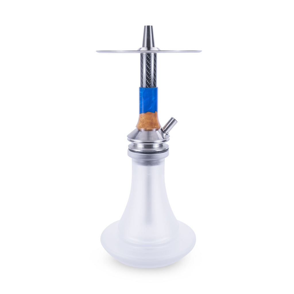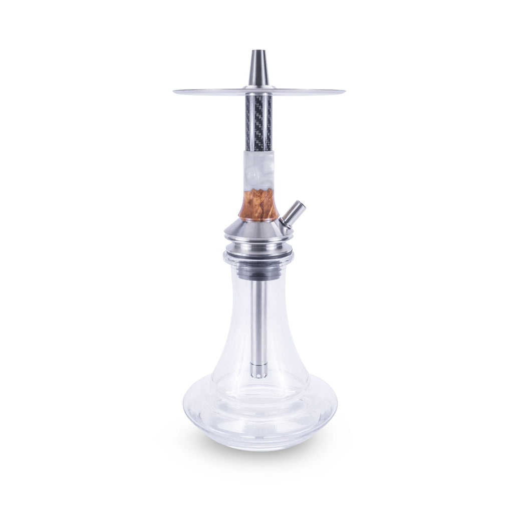 The VYRO - Penta is a compact (approx. 39 cm) plugin hookah made of V2A stainless steel, real carbon fiber, resin, and wood. The blow-off is located below the ashtray and ensures a quick and pleasant venting. When purged, the hookah smoke bounces off the ashtray and is directed downwards. To enable you to quickly replace your bowl, the ashtray can be easily removed from the smoke column through the ground joint adapter. In addition, e.g. a molasses catcher (18/8 joint) can be integrated. The ashtray of the VYRO - Penta has a small elevation on the outer edge hindering coals on the ashtray from falling down. The elevation in the middle of the ashtray prevents the coal from reaching the bowl gasket, which protects it. The purge is hidden under the ashtray in this elevation.